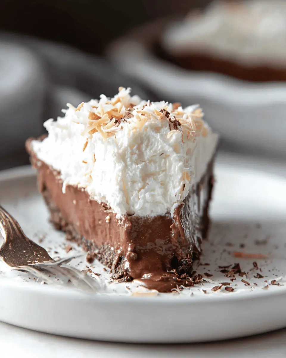 Serving chocolate coconut cream pie is all about presentation! Chill it well before serving for the best flavor and texture. Consider garnishing with toasted coconut and chocolate shavings for an elegant touch. For an extra layer of indulgence, drizzle some chocolate sauce or a dollop of extra whipped cream on top. Remember, sliced pieces paired with a hot cup of coffee make for a delightful treat!